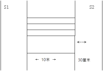 場(chǎng)地器材:10米長(zhǎng)的直線跑道若干,在跑道的兩端線(S1和S2)外30厘米處各劃一條線(圖1)。木塊(5厘米×10厘米)每道3塊,其中2塊放在S2線外的橫線上,一塊放在S1線外的橫線上。秒表若干塊,使用前應(yīng)進(jìn)行校正。