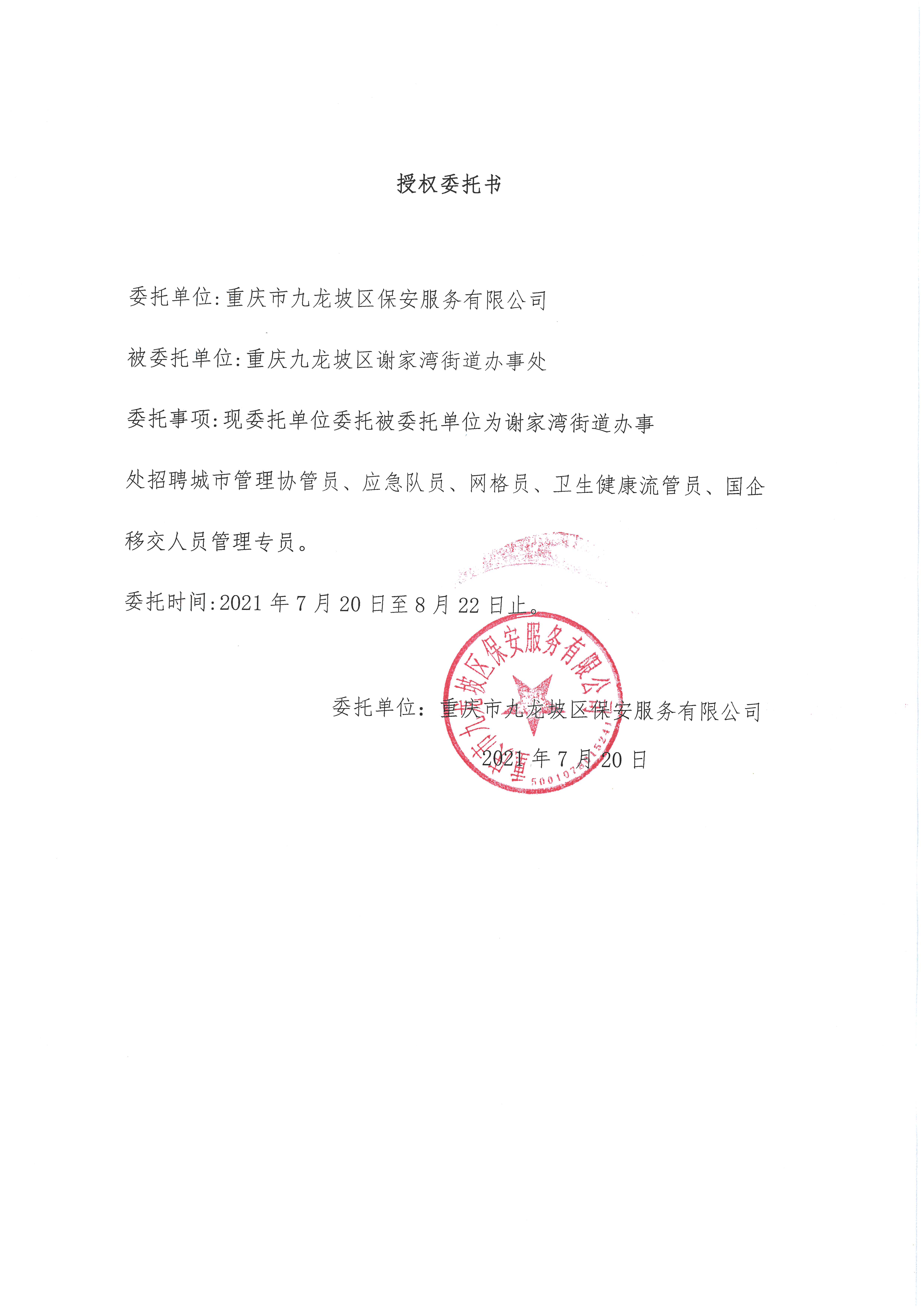 對體檢、政審合格的擬聘用人員進行公示,公示期為5個工作日,公示無異議后,提交街道黨工委會議研究確定。擬聘用人員與第三方勞務(wù)公司重慶市九龍坡區(qū)保安服務(wù)有限公司簽訂勞動合同,試用期2個月,試用期不合格的,解除聘用。