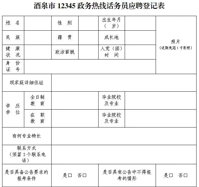 附件:《酒泉市12345政務(wù)熱線話務(wù)員應(yīng)聘登記表》
