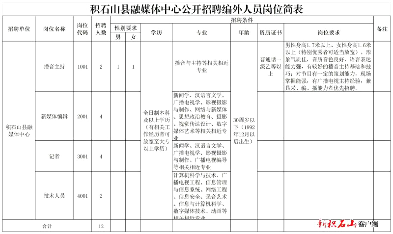 本次公開招聘臨聘人員共12名,詳見《積石山縣融媒體中心公開招聘編外人員崗位簡(jiǎn)表》(以下簡(jiǎn)稱《崗位簡(jiǎn)表》)。