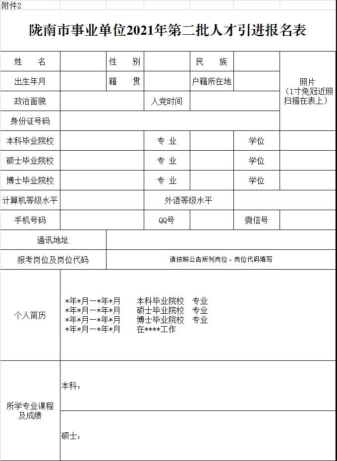 2.隴南市事業(yè)單位2021年第二批人才引進(jìn)報(bào)名表