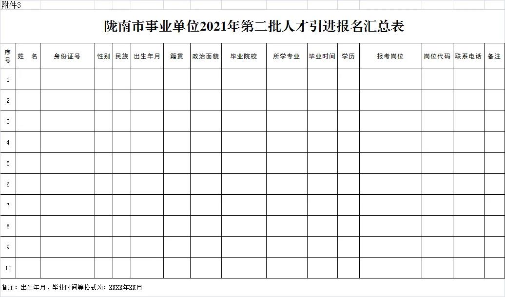 3.報(bào)名材料?,F(xiàn)場(chǎng)報(bào)名人員須持畢業(yè)證(含電子注冊(cè)備案表)、學(xué)位證、報(bào)到證、身份證原件及復(fù)印件,《隴南市事業(yè)單位2021年第二批人才引進(jìn)報(bào)名表》(附件2),《隴南市事業(yè)單位2021年第二批人才引進(jìn)報(bào)名匯總表》(附件3),近期2寸正面免冠藍(lán)底彩色照片電子版(JPG格式)。除上述材料,留學(xué)人員要提供由教育部出具的境外學(xué)歷、學(xué)位認(rèn)證書及駐外大使館留學(xué)回國(guó)人員證明。網(wǎng)上報(bào)名人員要建立一個(gè)以“報(bào)名人員姓名+崗位代碼”為名的文件夾,如王XX(A001)。文件夾中包含現(xiàn)場(chǎng)報(bào)名人員提交所有材料的彩色掃描件,其中附件2、附件3須提供電子版。