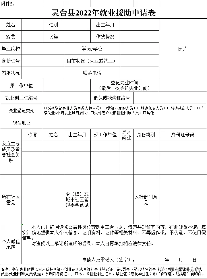 2.靈臺縣2022年就業(yè)援助申請表