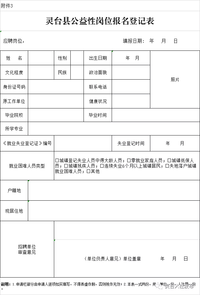 3.靈臺縣公益性崗位報名登記表