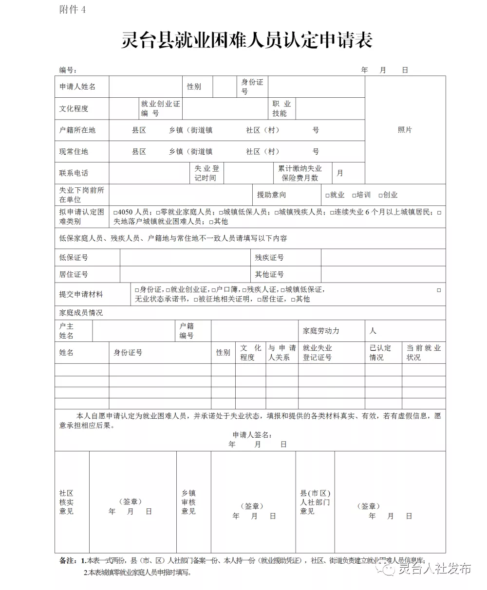 4.靈臺縣就業(yè)困難人員認定申請表(此表零就業(yè)家庭人員提供,其余就業(yè)困難人員不提供)