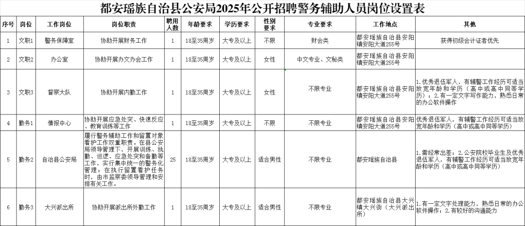 都安瑤族自治縣公安局本次擬招聘警務(wù)輔助人員30人,具體招聘崗位、人數(shù)、資格條件詳見《都安瑤族自治縣公安局2025年公開招聘警務(wù)輔助人員崗位設(shè)置表》