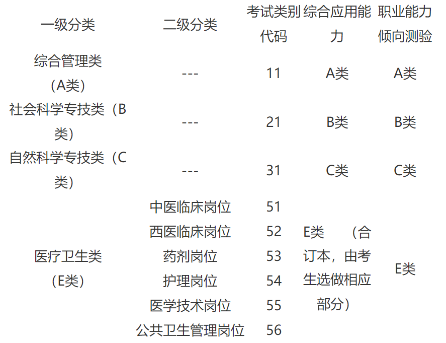 筆試科目為《綜合應(yīng)用能力》和《職業(yè)能力傾向測驗》兩科,每科分值為150分。按分類進行考試,不同類別的考試使用不同的試題??荚囶悇e分為綜合管理類(A類)、社會科學(xué)專技類(B類)、自然科學(xué)專技類(C類)和醫(yī)療衛(wèi)生類(E類)四類。