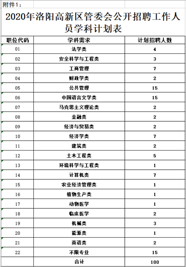 計劃公開招聘100人,涉及學科類別21個,另設一個不限學科門類,各學科的招聘數(shù)量詳見《2020年洛陽高新區(qū)管委會公開招聘工作人員學科計劃表》(附件1),各學科類別的具體專業(yè)要求詳見《2020年洛陽高新區(qū)管委會公開招聘工作人員考試學科分類專業(yè)對照表》(附件2)。