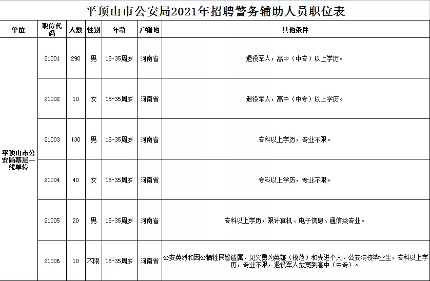 2021-09-24 01:06:00閱讀()平頂山公共招聘網(wǎng)根據(jù)工作需要,平頂山市公安局面向社會公開招聘警務(wù)輔助人員500名(男性450名、女性50名,具體崗位見職位表)?,F(xiàn)將有關(guān)事項公告如下: