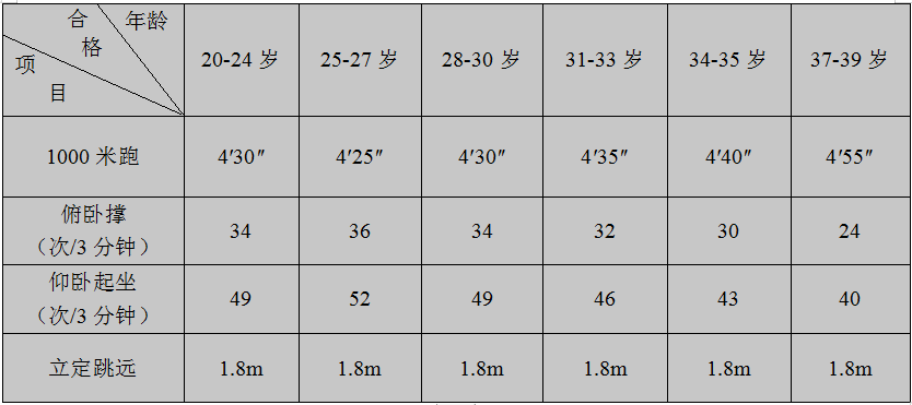 考生以上四個(gè)項(xiàng)目,如有一項(xiàng)未達(dá)到合格(60分)標(biāo)準(zhǔn)的,不得進(jìn)入面試環(huán)節(jié)。各測(cè)試項(xiàng)目合格標(biāo)準(zhǔn)見下表: