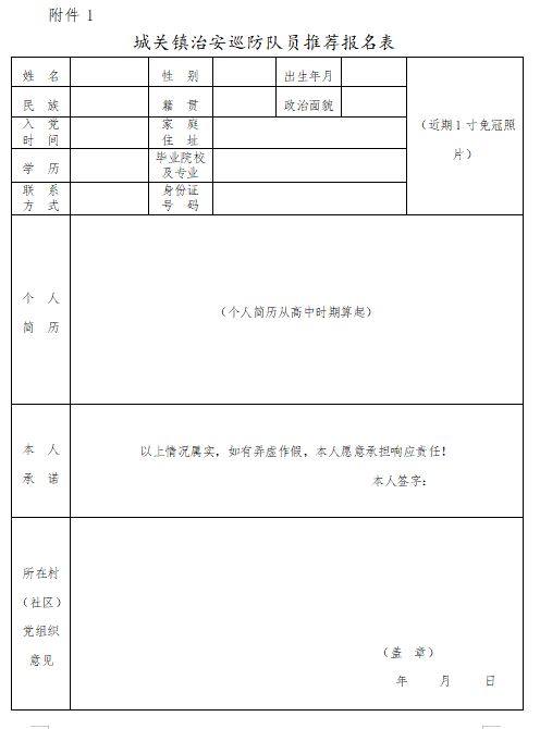 附件1:《城關(guān)鎮(zhèn)治安巡防隊(duì)員推薦報(bào)名表》