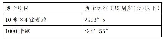 根據(jù)面試成績(jī),按照招聘崗位數(shù)1:1.5的比例從高分到低分的順序確定體能測(cè)試人選。具體測(cè)試內(nèi)容及標(biāo)準(zhǔn)如下: