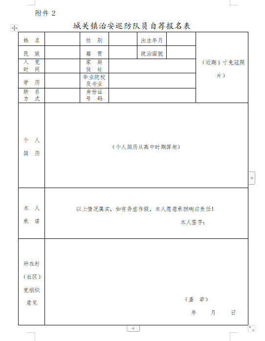 附件2:《城關(guān)鎮(zhèn)治安巡防隊(duì)員自薦報(bào)名表》