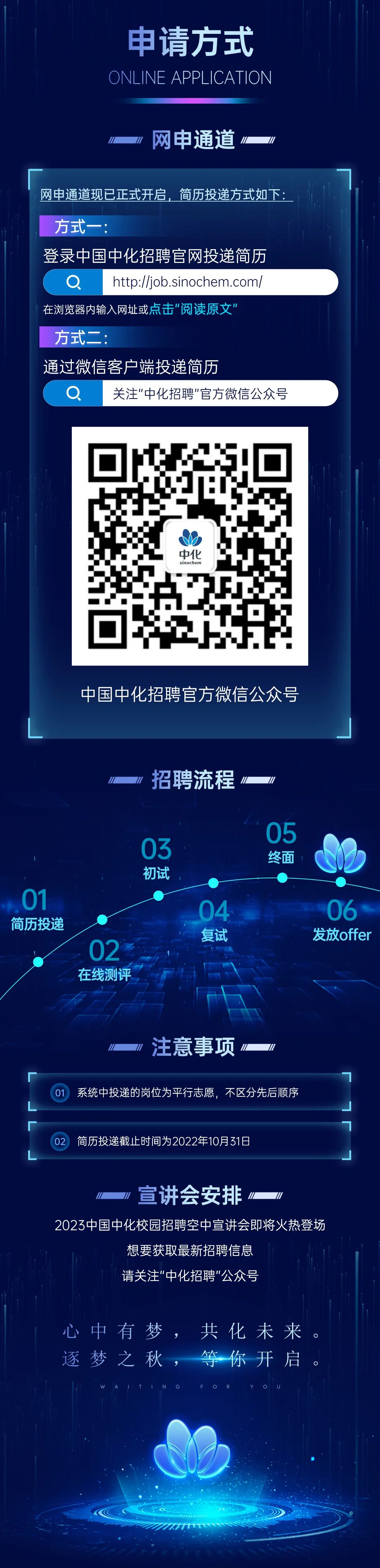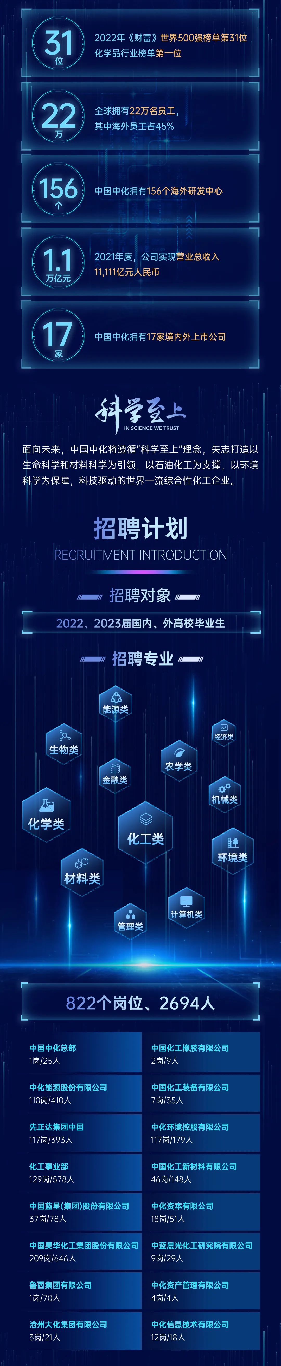 2022-09-13 11:37:24閱讀()中國雄安據(jù)國聘發(fā)布消息,中國中化控股有限責任公司現(xiàn)招聘2694名2022、2023屆國內(nèi)外高校畢業(yè)生,共822個崗位。有意者可于10月31日前登錄中國中化招聘官網(wǎng)(https://sinochem.hotjob.cn/)或關注“中化招聘”官方微信公眾號投遞簡歷。