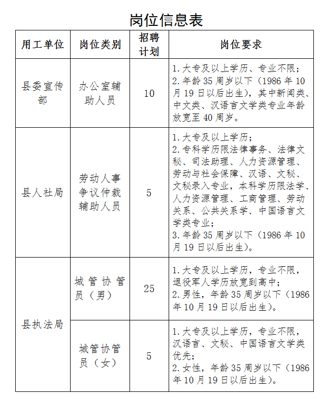 2022-10-14 22:11:06閱讀()安平縣人民政府因工作需要,中共安平縣委宣傳部招聘勞務(wù)派遣制工作人員10名,縣人社局招聘勞動人事爭議仲裁辦案輔助人員5名,縣城市管理綜合行政執(zhí)法局招聘城管協(xié)管員30名。為順利推進招聘工作,現(xiàn)將有關(guān)事項公告如下:
