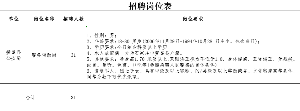 2024-11-30 19:46:44閱讀()贊皇縣人力資源和社會保障局根據(jù)工作需要,經(jīng)縣政府批準,縣人力資源和社會保障局委托第三方人力資源公司面向社會公開招聘警務(wù)輔助人員31名,有關(guān)事項公告如下: