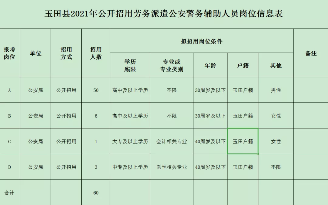 公開招用勞務(wù)派遣公安警務(wù)輔助人員60人,其中男性50人,女性7人,不限3人。