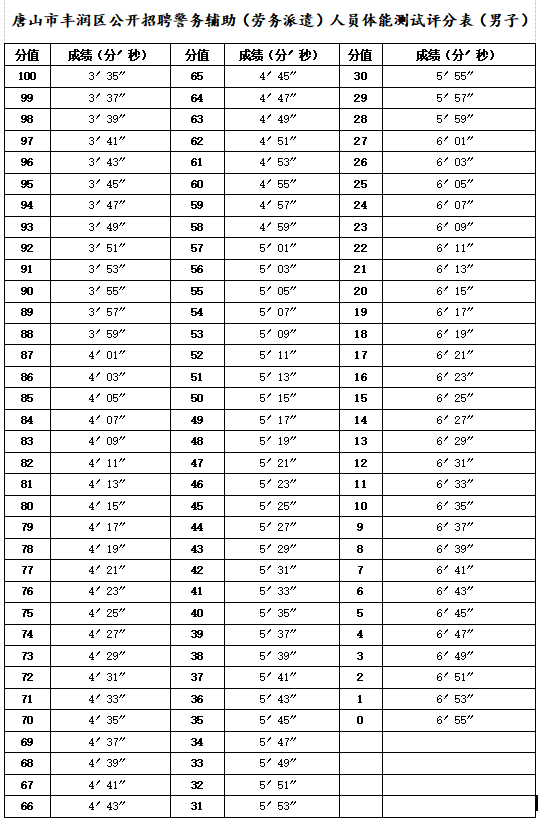 (3)測試成績。參考《公安機關(guān)錄用人民警察體能測評項目和標準》制定《唐山市豐潤區(qū)公開招聘警務(wù)輔助(勞務(wù)派遣)人員體能測評評分表》(見附件),總分100分,根據(jù)體能測評所用時間確定排名順序。未跑完全程不計成績。體能測評成績0分的為不合格成績,不進入下一環(huán)節(jié)。體能測評成績通過“豐潤人才發(fā)展集團公開招聘 (http://gkks.frrcjt.com/)”發(fā)布。