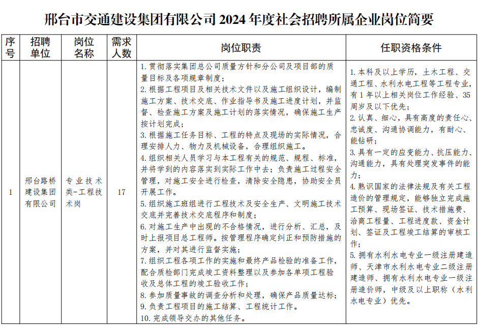 附件:邢臺(tái)市交通建設(shè)集團(tuán)有限公司2024年度社會(huì)招聘所屬企業(yè)崗位簡(jiǎn)要