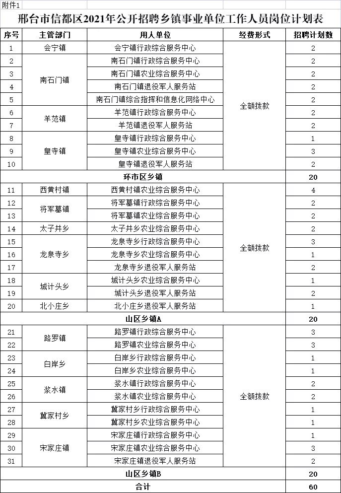 本次招聘鄉(xiāng)鎮(zhèn)事業(yè)單位工作人員共60名(全額事業(yè)編制),具體崗位計(jì)劃詳見《邢臺(tái)市信都區(qū)2021年公開招聘鄉(xiāng)鎮(zhèn)事業(yè)單位工作人員崗位計(jì)劃表》(附件1)。