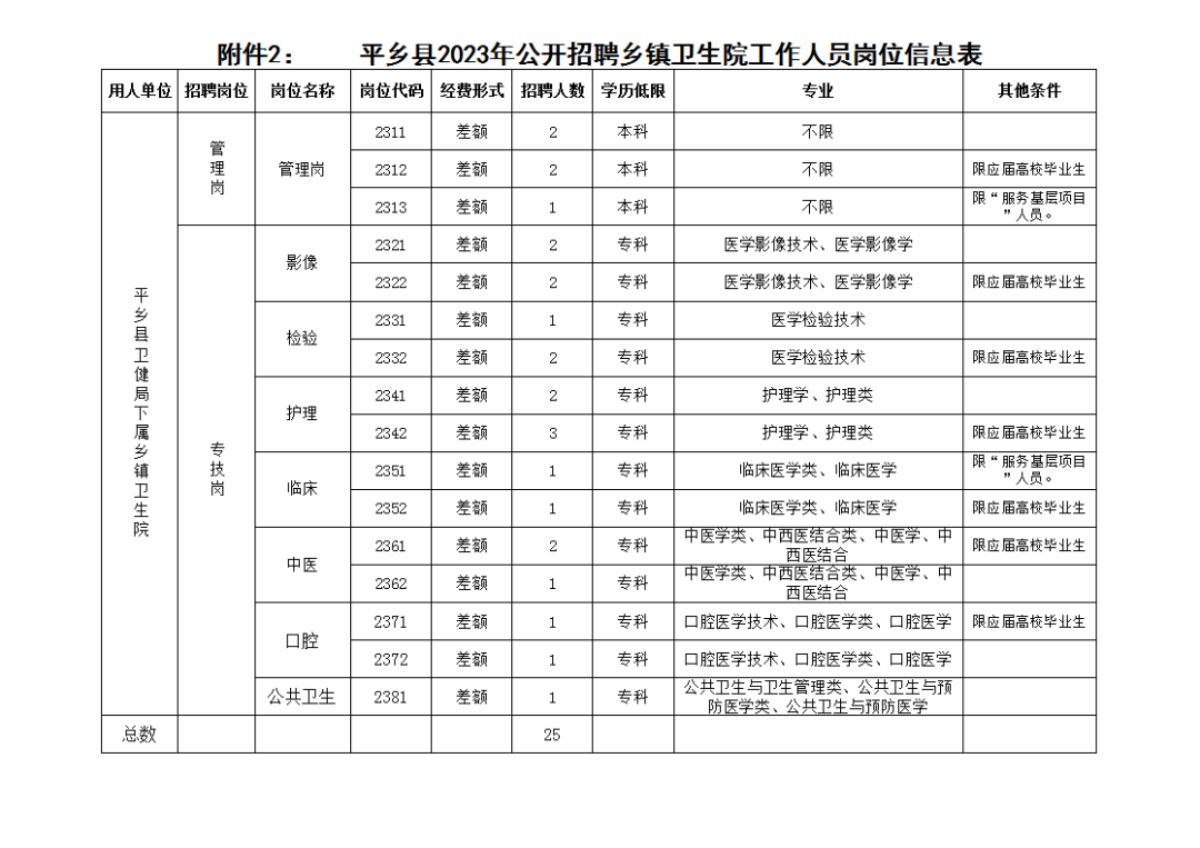公開招聘鄉(xiāng)鎮(zhèn)衛(wèi)生院工作人員25名。其中:管理崗5名,專技崗20名。詳見《平鄉(xiāng)縣2023年公開招聘鄉(xiāng)鎮(zhèn)衛(wèi)生院工作人員崗位計(jì)劃表》(附件1),《平鄉(xiāng)縣2023年公開招聘鄉(xiāng)鎮(zhèn)衛(wèi)生院工作人員崗位信息表》(附件2)。
