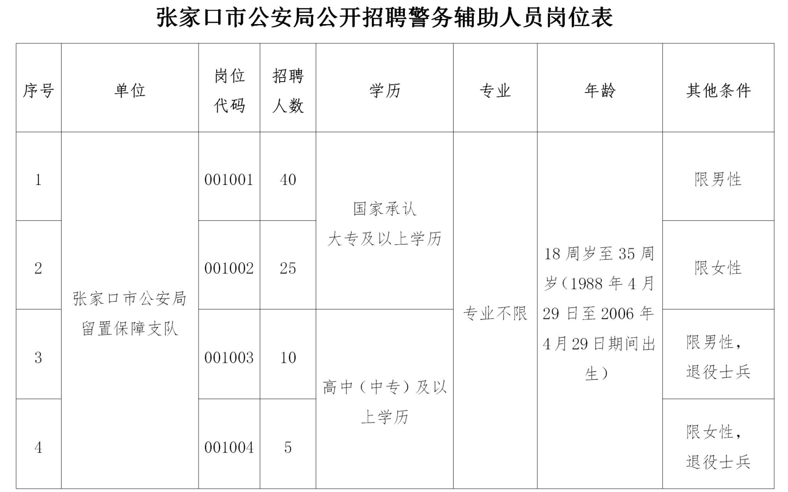 此次招聘輔警共計80名,男性50名,女性30名。年齡在18周歲至35周歲(1988年4月29日至2006年4月29日期間出生),國家承認大專及以上學歷,崗位代碼001003、001004崗位限退役士兵,學歷放寬至高中(中專)及以上,報名時須在工作簡歷中注明服役時間及部隊番號。具體詳見《張家口市公安局公開招聘警務(wù)輔助人員崗位表》,現(xiàn)役軍人、在校在讀學生均不得報考。