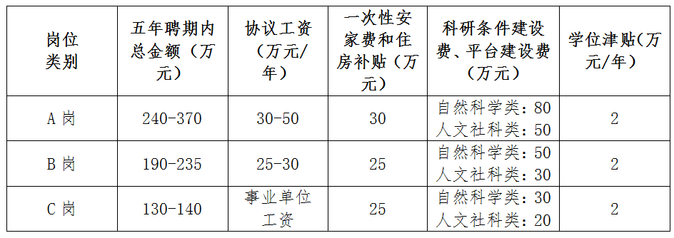 按照學校有關文件精神,與學校簽訂人才引進協(xié)議,兌現(xiàn)人才待遇。其中,博士可申報A、B、C三類崗位,相關待遇如下: