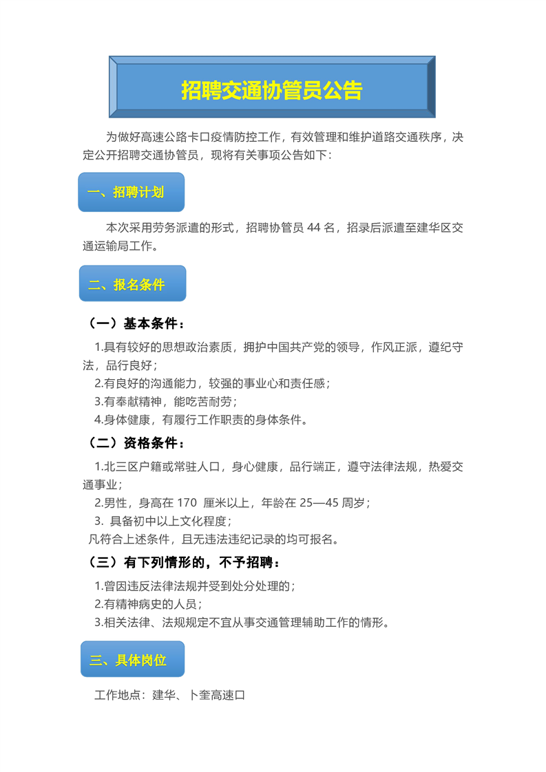 2022-10-21 22:56:46閱讀()齊齊哈爾市建華區(qū)人民政府為做好高速公路卡口疫情防控工作,有效管理和維護道路交通秩序,決定公開招聘交通協(xié)管員,現(xiàn)將有關(guān)事項公告如下: