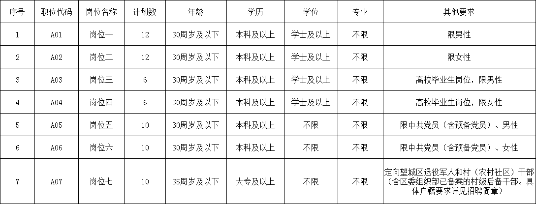 1.年齡要求:崗位A01、A02、A03、A04、A05、A06考生要求30周歲及以下(1994年6月11日及以后出生);崗位A07考生要求35周歲及以下(1989年6月11日及以后出生)。