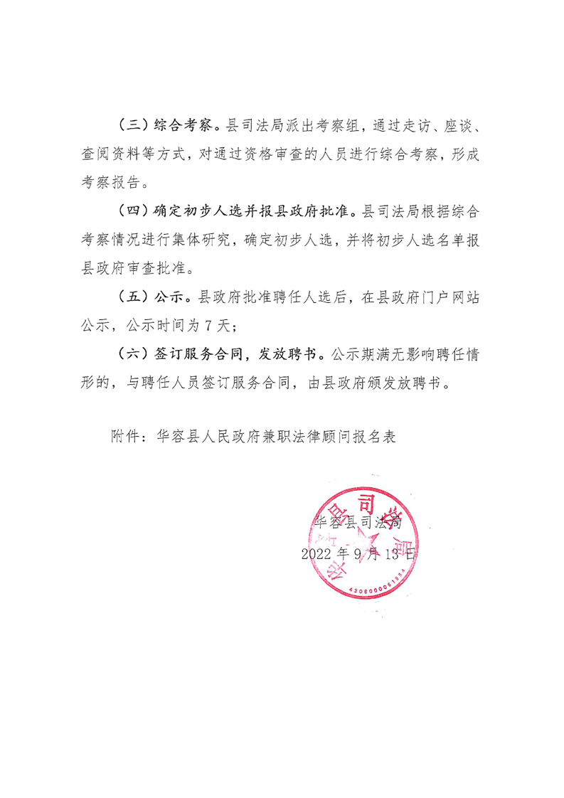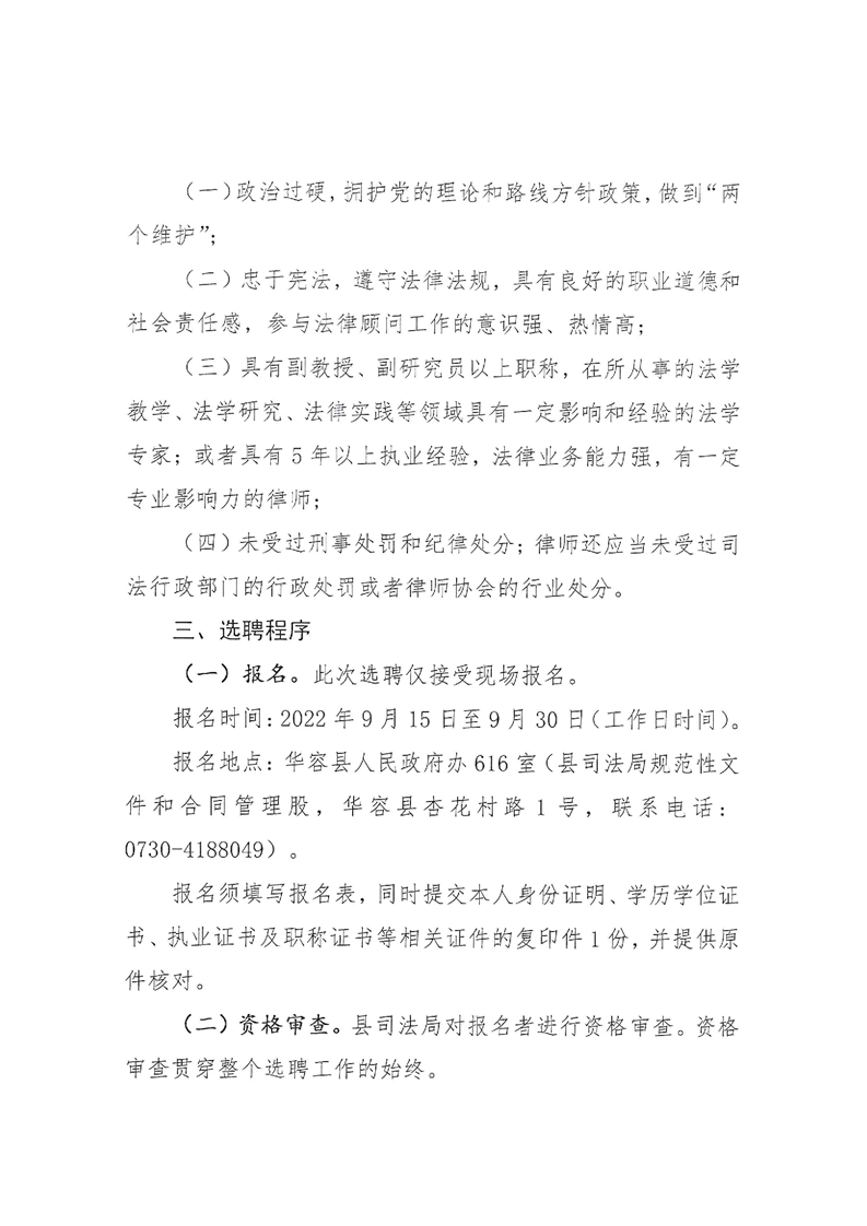 2022-09-14 11:05:00閱讀()華容縣人民政府華容縣司法局關(guān)于公開選聘縣政府兼職法律顧問公告