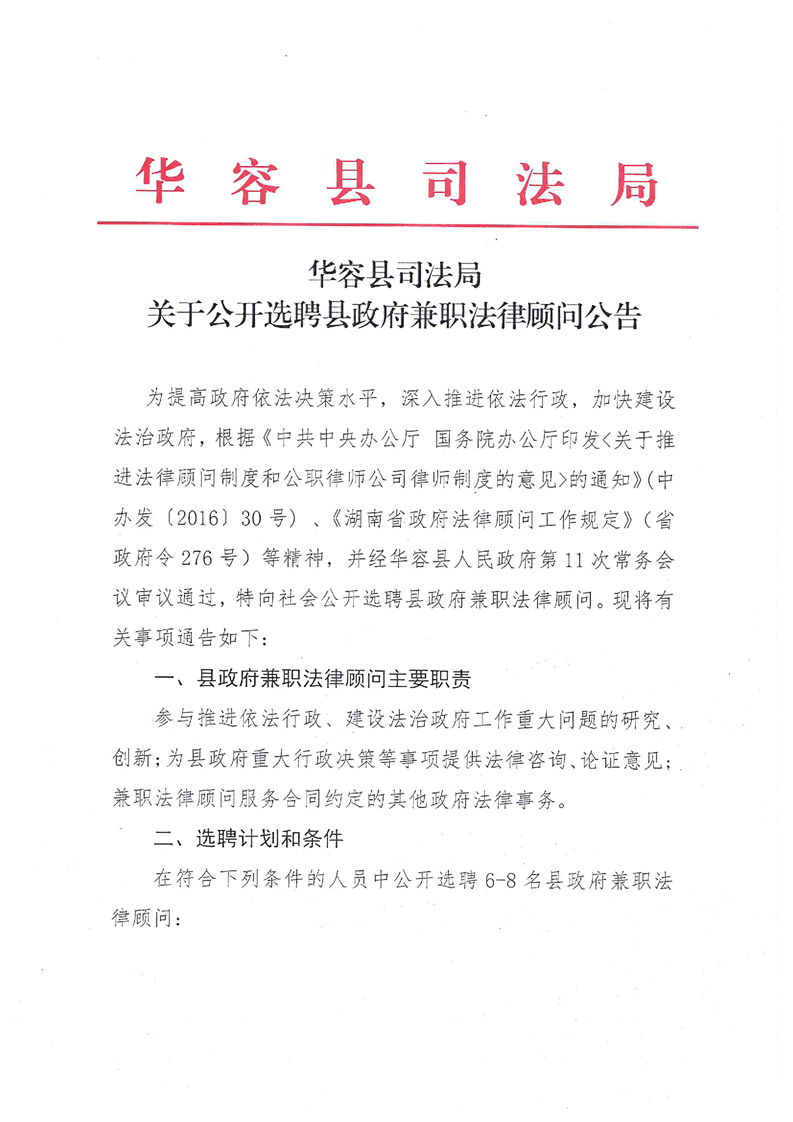 為提高政府依法決策水平,深入推進(jìn)依法行政,加快建設(shè)法治政府,根據(jù)《中共中央辦公廳國務(wù)院辦公廳印發(fā)<關(guān)于推進(jìn)法律顧問制度和公職律師公司律師制度的意見>的通知》(中辦發(fā)〔2016〕30 號)、《湖南省政府法律顧問工作規(guī)定》(省政府令276號)等精神,并經(jīng)華容縣人民政府第11次常務(wù)會(huì)議審議通過,特向社會(huì)公開選聘縣政府兼職法律顧問。現(xiàn)將有關(guān)事項(xiàng)通告如下: