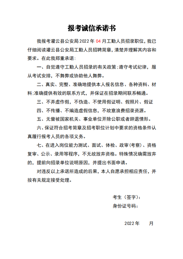 8.連云港市公安機關在職輔警、工勤人員需攜帶單位同意報考證明。曾因違反公安機關管理規(guī)定解除勞動合同的人員,不得報考。應聘人員如提供虛假材料,一經(jīng)查實,即取消報名資格。對偽造、變造有關證件、材料、信息、騙取招考資格的,將按有關法律法規(guī)嚴肅處理。