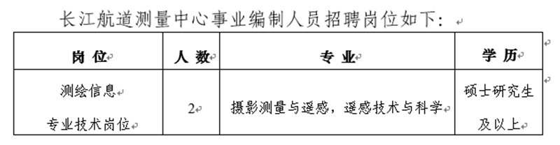 2022-03-14 01:37:29閱讀()長江航道局長江航道測(cè)量中心根據(jù)事業(yè)發(fā)展需要,現(xiàn)面向社會(huì)公開招聘事業(yè)編制工作人員,有關(guān)事宜公告如下: