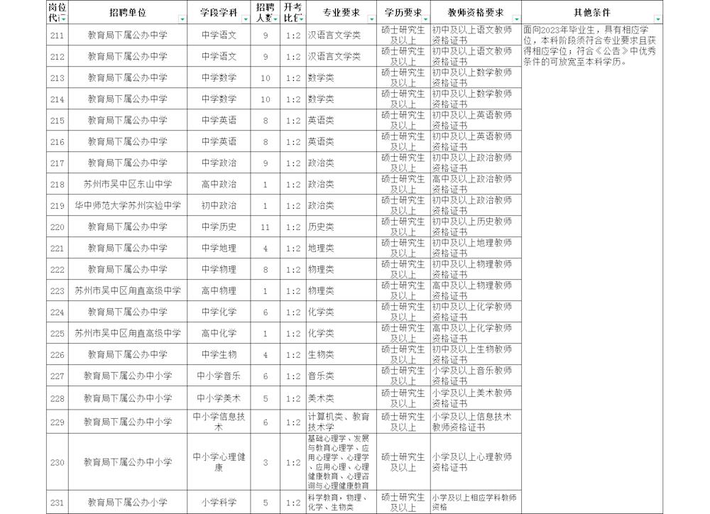 (四)具備《2023年蘇州市吳中區(qū)教育局公開(kāi)招聘中小學(xué)教師崗位簡(jiǎn)介表》(見(jiàn)附件)中要求的資格條件,崗位簡(jiǎn)介表中對(duì)招聘崗位基本條件和其他資格條件另有規(guī)定的從其規(guī)定,工作經(jīng)歷計(jì)算的截止時(shí)間為2023年8月31日。