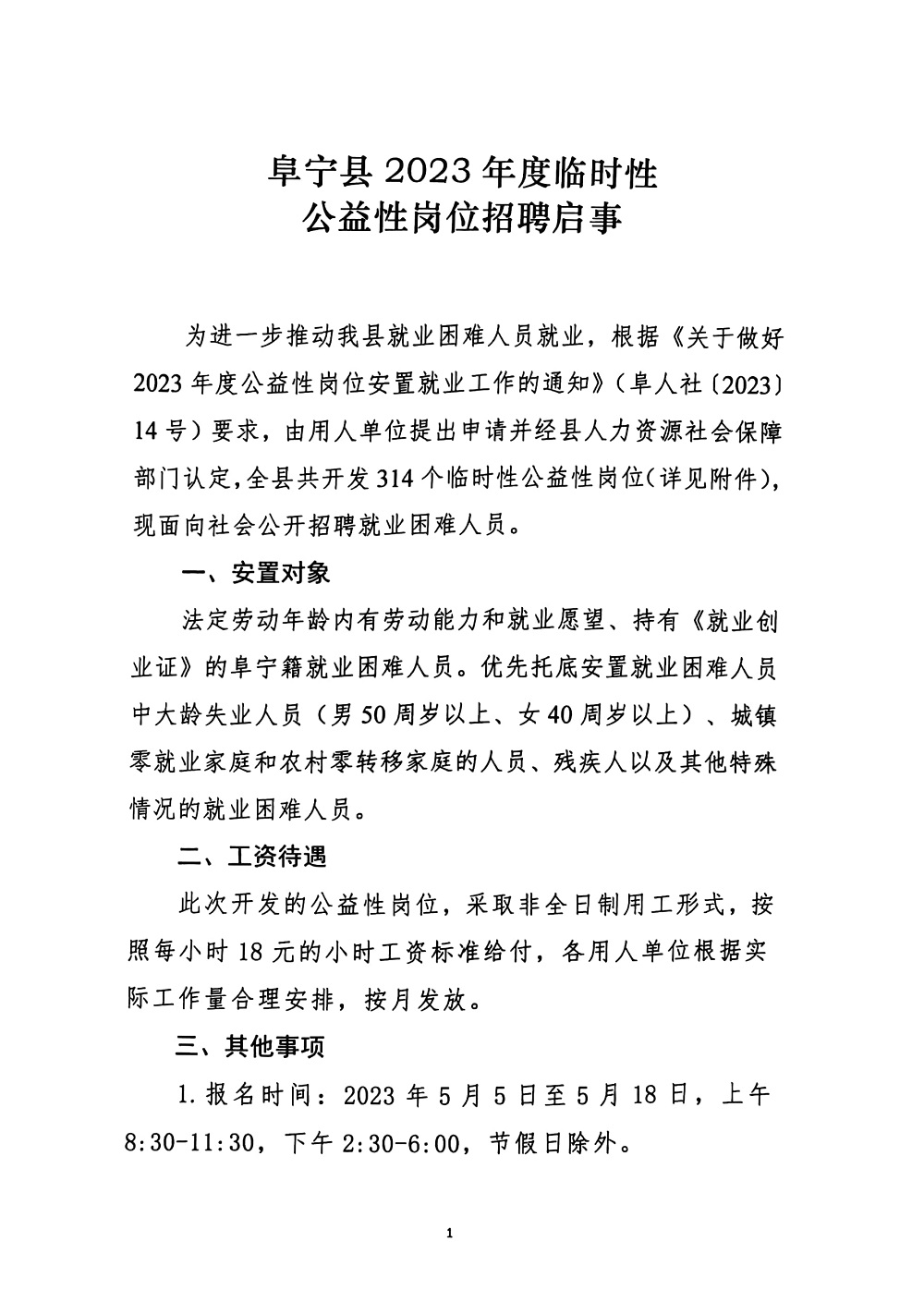 2023-05-06 16:23:32閱讀()阜寧縣人民政府為進一步推動我縣就業(yè)困難人員就業(yè),根據(jù)《關(guān)于做好2023年度公益性崗位安置就業(yè)工作的通知》(阜人社〔2023)14號)要求,由用人單位提出申請并經(jīng)縣人力資源社會保障部門認(rèn)定,全縣共開發(fā)314個臨時性公益性崗位(詳見附件),現(xiàn)面向社會公開招聘就業(yè)困難人員。