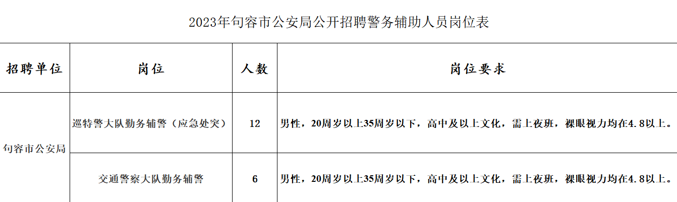 5.招聘崗位、人數(shù)和所要求的年齡、性別、學(xué)歷、身體條件等資格條件詳見《2023年句容市公安局公開招聘警務(wù)輔助人員崗位表》(附件1)。