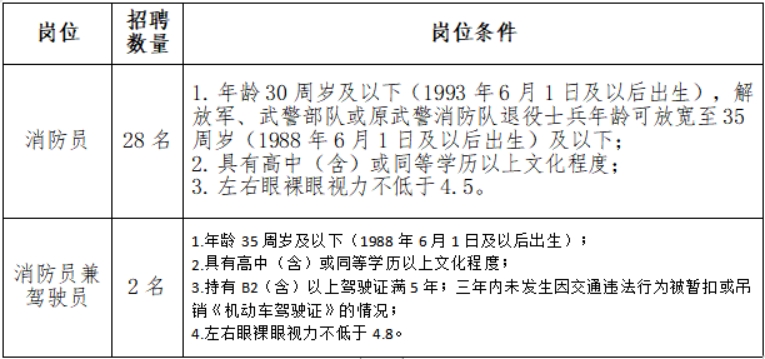 招聘崗位為區(qū)專業(yè)森林消防大隊合同制隊員30名,其中消防員28名(報名人數(shù)須達(dá)到1:1.5以上,否則按照比例減少招聘人數(shù)),消防員兼駕駛員2名(報名人數(shù)須達(dá)到1:2以上,否則按比例減少招聘人數(shù))。