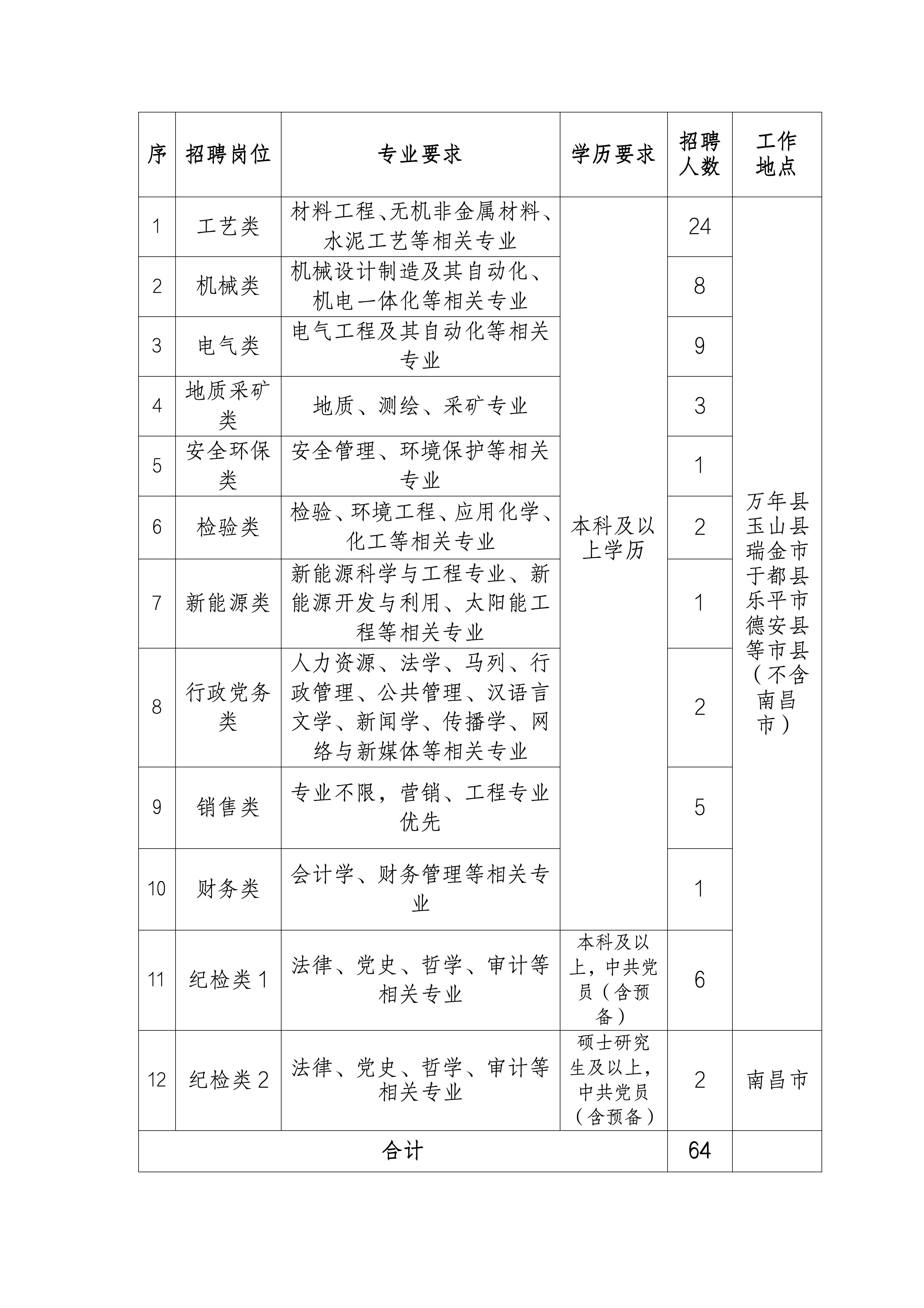 為滿足公司的生產(chǎn)經(jīng)營(yíng)需求,面向社會(huì)公開(kāi)招聘,本次招聘崗位類(lèi)別12個(gè),招聘人數(shù)共計(jì)64人,人員分配到江西省內(nèi)下屬各生產(chǎn)基地。