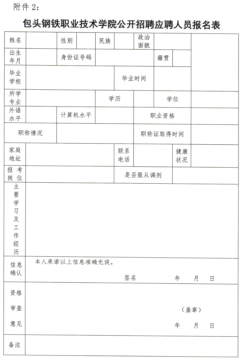 ①《包頭鋼鐵職業(yè)技術(shù)學(xué)院2022年對外公開招聘高校畢業(yè)生報名表》(詳見附件2);