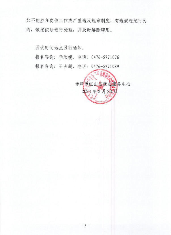 確定擬聘用人員名單,由赤峰市紅山區(qū)就業(yè)服務(wù)中心統(tǒng)一進(jìn)行公示,接受社會(huì)監(jiān)督,公示期為5個(gè)工作日。公示期滿,對(duì)沒有問題或者反映問題不影響聘用的,辦理聘用手續(xù)。對(duì)反映有嚴(yán)重問題的并查有實(shí)據(jù)的,取消聘用資格。