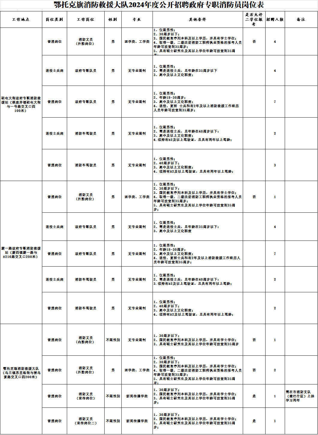 烏蘭鎮(zhèn)共計5人,均為消防文員,其中外勤2人,內勤3人;棋盤井鎮(zhèn)共計20人,其中消防文員4人,政府專職消防隊員11人,消防車駕駛員5人;蒙西鎮(zhèn)共計16人,其中消防文員1人,政府專職消防隊員11人,消防車駕駛員4人;具體崗位要求詳見《鄂托克旗消防救援大隊2024年度公開招錄政府專職消防員崗位信息表》(附件1)。