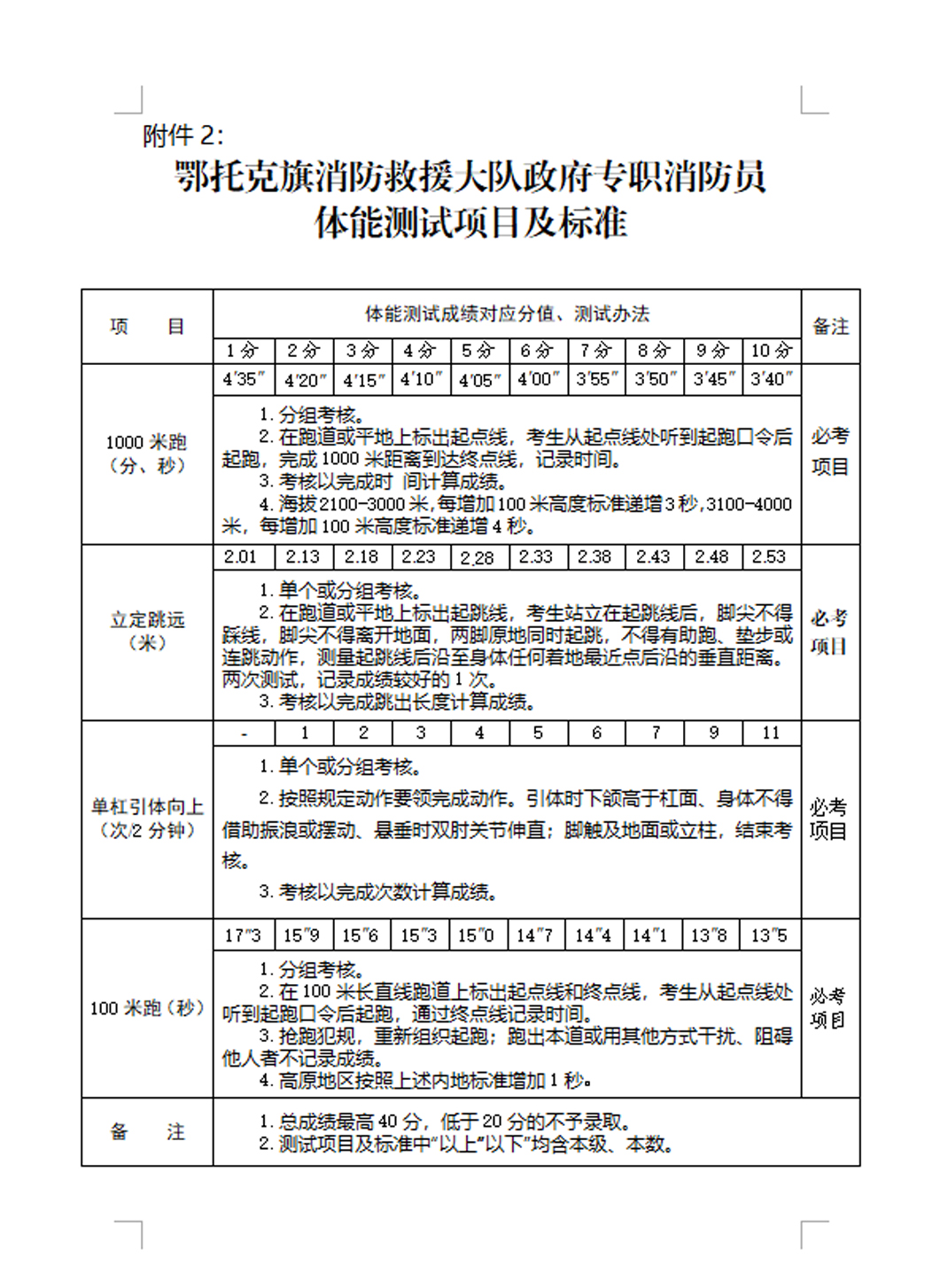 按照《鄂托克旗消防救援大隊政府專職消防員體能測試項目及標準》(附件2)執(zhí)行。參加體能測試人員要在考前簽訂《鄂托克旗消防救援大隊政府專職消防員招錄體能測試承諾書》(附件3),體能測試實行量化評分,滿分40分。測試結束后按人員綜合成績排名順序,按一定比例確定人選。如單項多人達到滿分以上成績,按照項目的分類,依據(jù)耗時短、距離長、數(shù)量多等原則進行排名。測試分組由現(xiàn)場抽簽決定,全程錄像拍攝,當場公布成績。另本次體能測試設置合格線,四項分數(shù)低于20分的不予進行錄、補用。