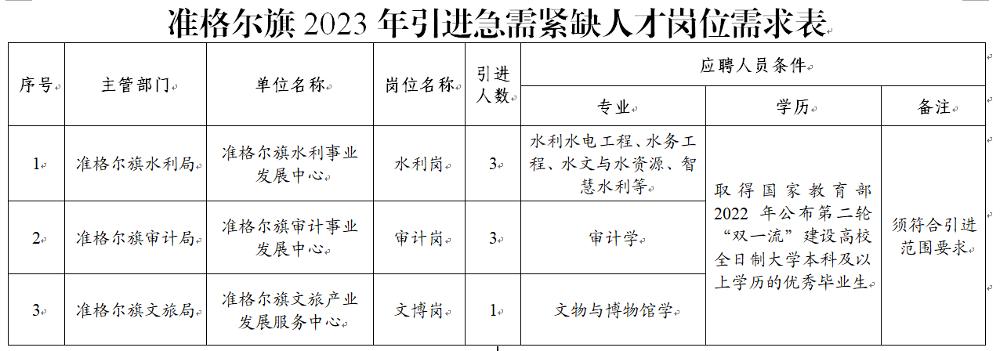 招聘崗位信息詳見《準(zhǔn)格爾旗2023年引進(jìn)急需緊缺人才崗位需求表》(附件1)。所學(xué)學(xué)科專業(yè)不在選定的專業(yè)目錄中,但與崗位所要求的學(xué)科專業(yè)類同的考生,可通過(guò)報(bào)名咨詢電話確認(rèn)報(bào)名資格。