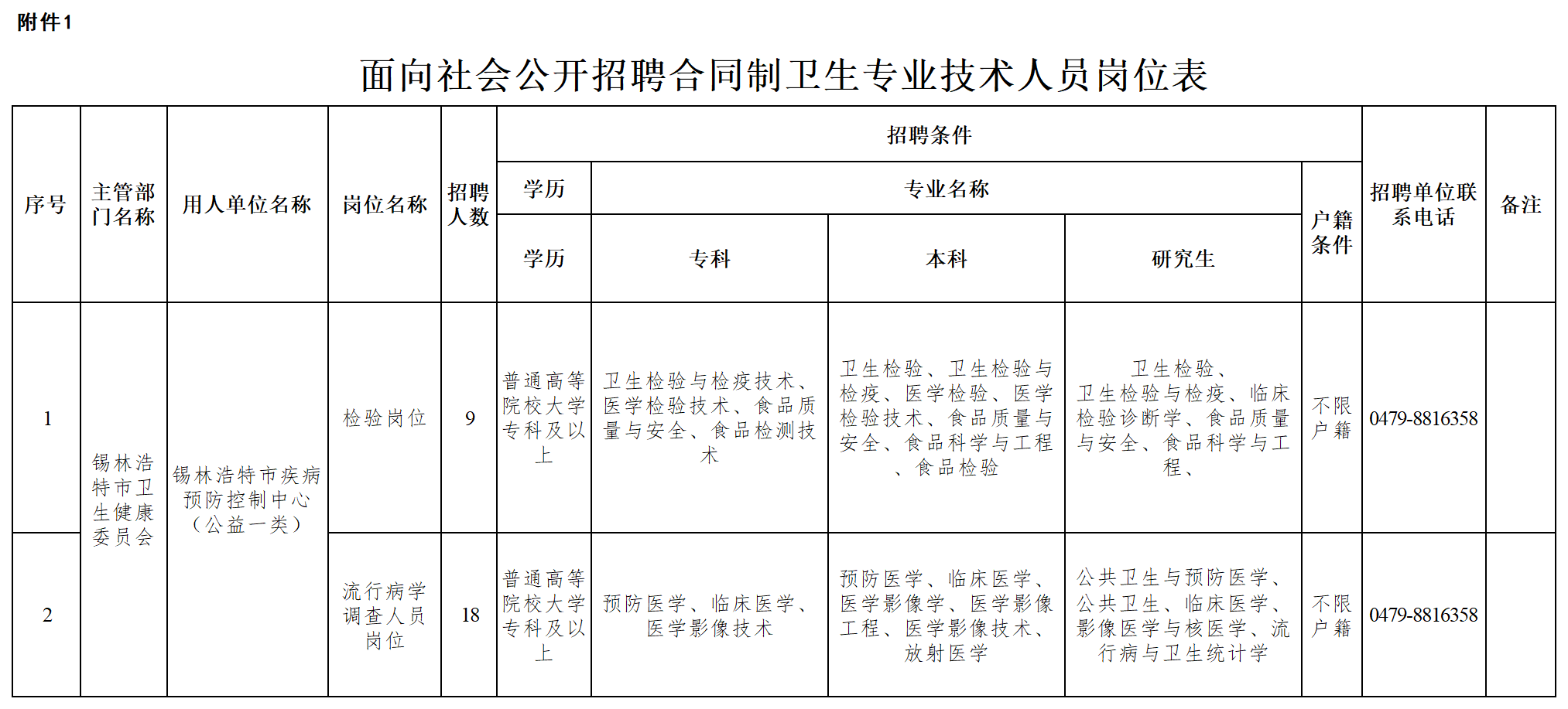 本次錫林浩特市疾病預(yù)防控制中心面向社會公開招聘合同制衛(wèi)生專業(yè)技術(shù)人員27人(其中:檢驗崗位9人、流行病學(xué)調(diào)查人員崗位18人)詳見附件1。