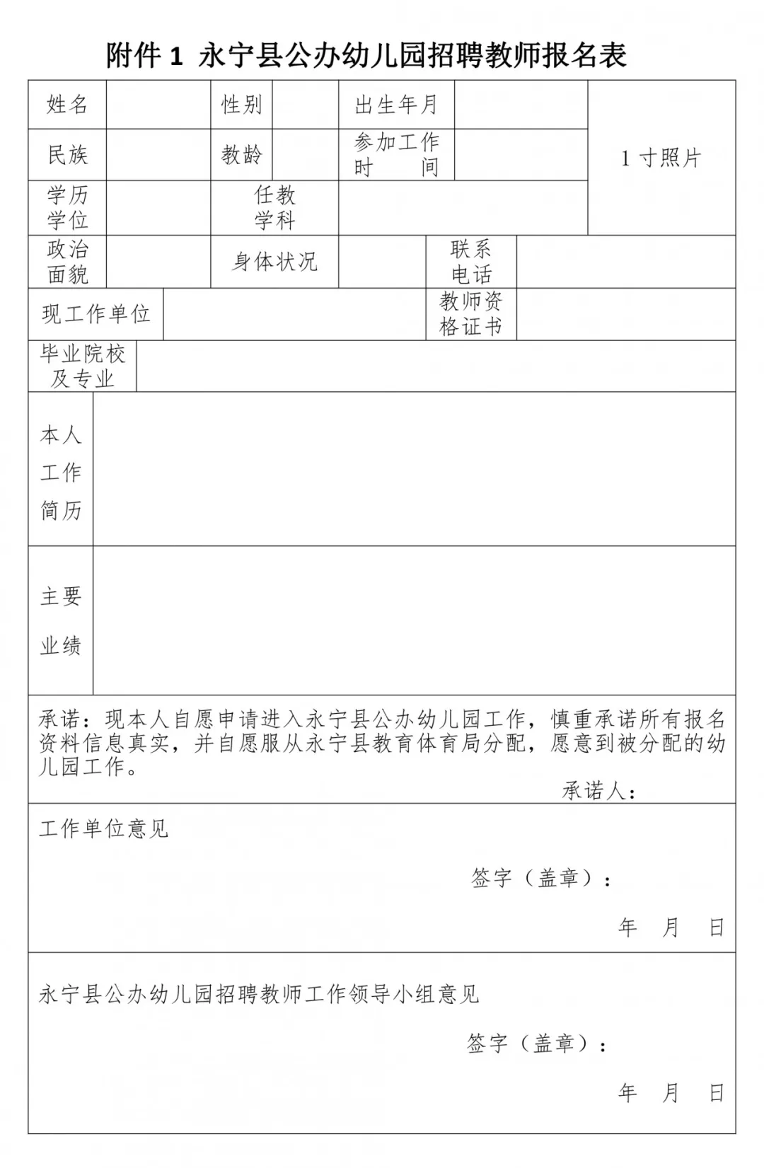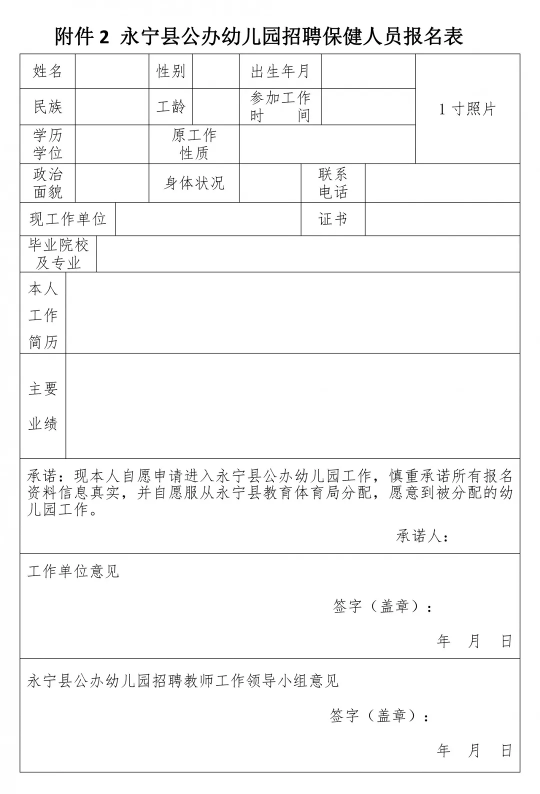 2、應(yīng)聘者填寫《永寧縣公辦幼兒園招聘教師報(bào)名表》(附件1)或《永寧縣公辦幼兒園招聘保健人員報(bào)名表》(附件2),并在規(guī)定時(shí)間內(nèi)報(bào)名。