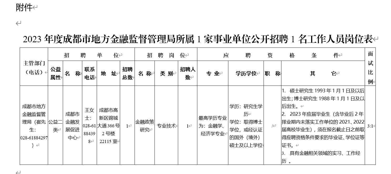 附件:2023年度成都市地方金融監(jiān)督管理局所屬1家事業(yè)單位公開招聘1名工作人員崗位表