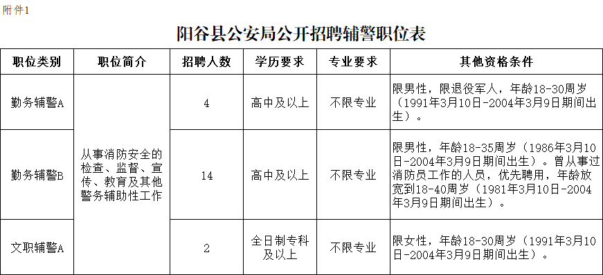 附件:1.《陽(yáng)谷縣公安局公開招聘輔警職位表》
