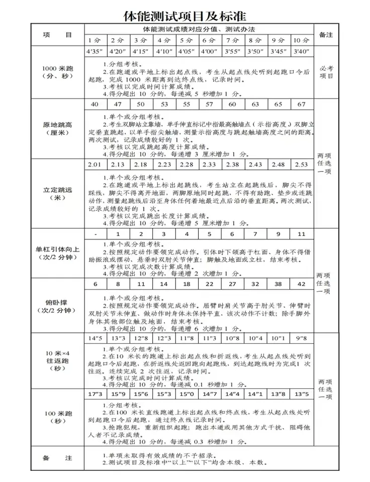 01體能、體型測試:標(biāo)準(zhǔn)參照《國家綜合性消防救援隊(duì)伍消防員招錄體能測試、崗位適應(yīng)性測試項(xiàng)目及標(biāo)準(zhǔn)》執(zhí)行??己隧?xiàng)目為:1000米跑必考項(xiàng);原地跳高、立定跳遠(yuǎn),兩項(xiàng)選一項(xiàng);單杠引體向上、俯臥撐,兩項(xiàng)選一項(xiàng);10米×4往返跑、100米跑兩項(xiàng)選一項(xiàng)。主要考察招收對象肌肉力量、肌肉耐力和爆發(fā)力等。