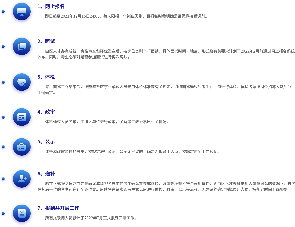1.選調(diào)生結(jié)合儲(chǔ)備人才項(xiàng)目同步開展,統(tǒng)一采取網(wǎng)上報(bào)名,網(wǎng)上報(bào)名時(shí)間截止到2021年11月10日24:00。 2.在規(guī)定時(shí)間內(nèi)成功報(bào)名“奉賢區(qū)定向選調(diào)生”的人員,經(jīng)奉賢區(qū)委組織部綜合遴選后,按一定比例擇優(yōu)推薦參加上海市定向選調(diào)考試,與上海市2022年度考試錄用公務(wù)員筆試一并進(jìn)行(一考兩用,即筆試成績可同時(shí)在選調(diào)生招錄和上海市2022年度考試錄用公務(wù)員中使用)。 3.經(jīng)上海市選調(diào)生筆試、面試、體檢、考察、公示、錄用等相關(guān)程序后,辦理選調(diào)生公務(wù)員錄用手續(xù)。錄用職位根據(jù)人崗相適原則,由區(qū)委組織部統(tǒng)一安排。 4.選調(diào)生正式錄用后,區(qū)委組織部負(fù)責(zé)安排選調(diào)生進(jìn)行為期兩年的基層培養(yǎng)鍛煉(其中第一年為試用期),按照大學(xué)生村官進(jìn)行管理。試用期滿考核合格的,按照相關(guān)規(guī)定進(jìn)行轉(zhuǎn)正定級(jí);不合格的,將取消錄用。 5.報(bào)名參加選調(diào)的應(yīng)屆畢業(yè)生,應(yīng)如實(shí)填報(bào)個(gè)人信息、提供任職和獲獎(jiǎng)證明材料。凡弄虛作假的,一律取消選調(diào)資格。