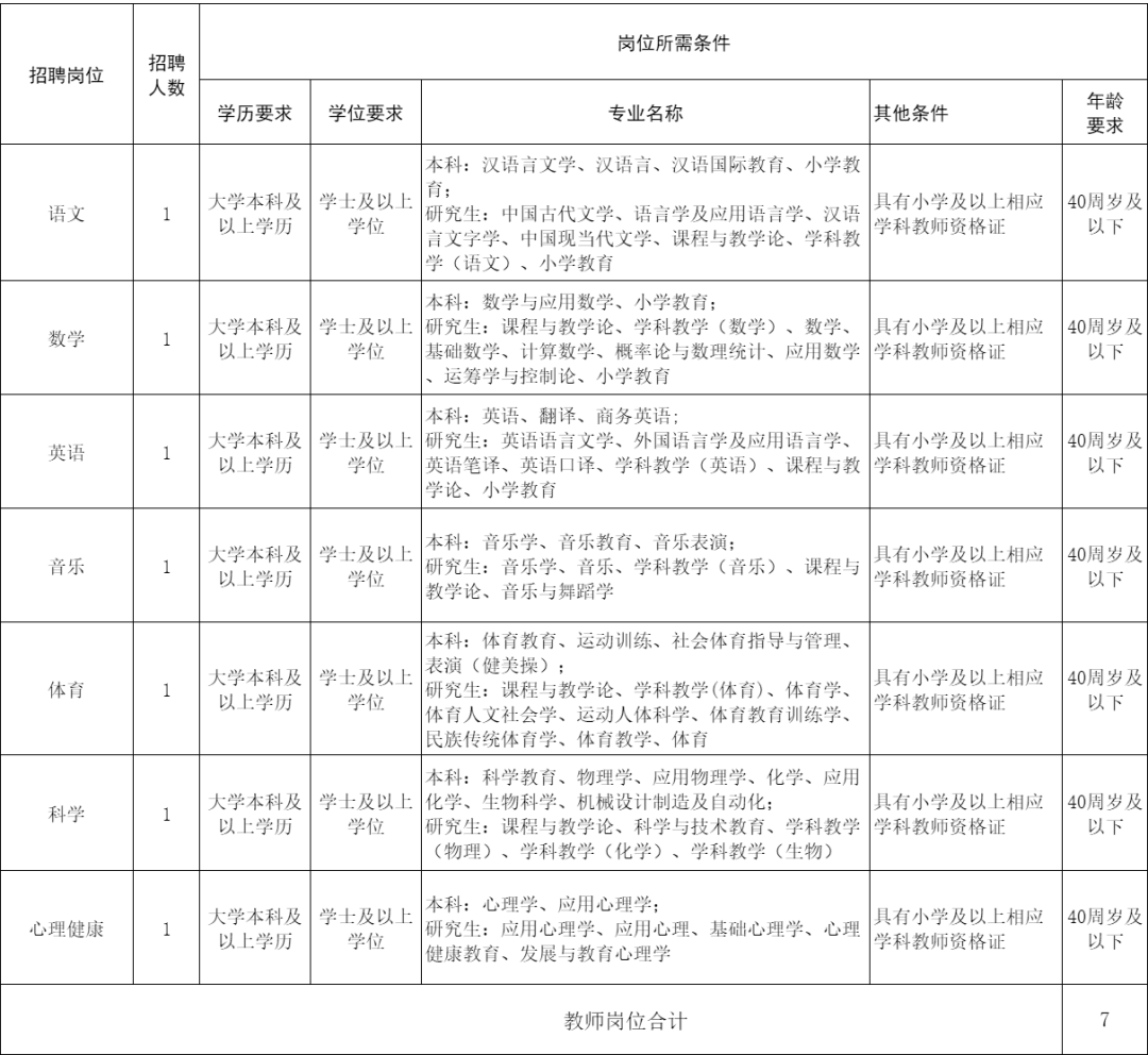 小學(xué)語文:5人、小學(xué)數(shù)學(xué):3人、小學(xué)英語:2人、小學(xué)體育:1人、小學(xué)音樂:1人、小學(xué)美術(shù):2人、小學(xué)道德與法治:1人 、小學(xué)信息技術(shù):1人、財務(wù):1人。